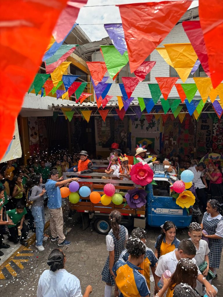 Ein besonderes Highlight war der große Kulturtag der Schule. Diese Feier findet einmal im Jahr statt und ist für die Schüler etwas ganz Besonderes, weil sie Kulturen aus der ganzen Welt vorstellen. Schon in den Wochen davor war die ganze Schule voller Musik, Farbe und Energie. Überall wurde getanzt, gesungen, gebastelt und gelacht. Ich durfte mit meiner Profe und der 11. Klasse das Land Brasilien begleiten. Sie führten einen brasilianischen Tanz mit portugiesischer Musik und traditionellen Kostümen auf. Außerdem gab es Tänze aus anderen Ländern wie Italien oder aus verschiedenen Regionen Kolumbiens, jede mit ihren eigenen Kleidern, Rhythmen und Traditionen. Die Eltern der Schüler haben viele der Kostüme selbst gebastelt. Eine Mutter vom Kindergarten hatte sogar für ihre Tochter ein Kleid aus Zeitungspapier gemacht, das wunderschön aussah.